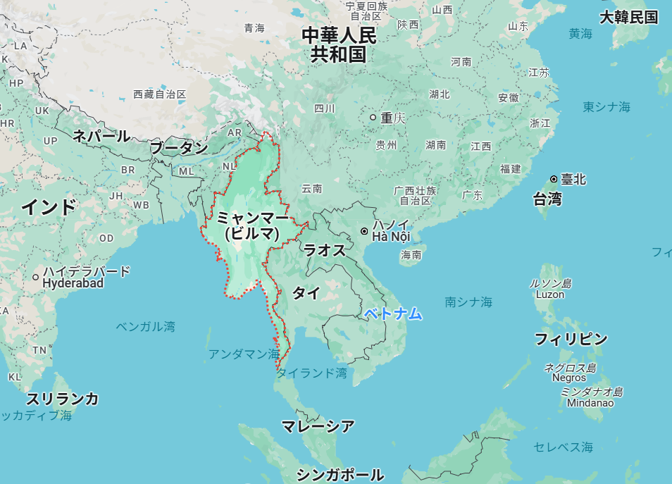 ミャンマーは、東でタイ、西でインド、北で中国と接していて、南はベンガル湾です。